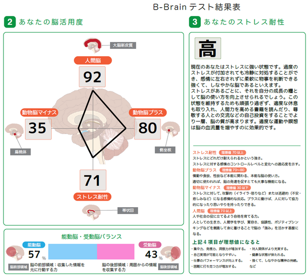 B-BRAINテストでは、メンタル状況を把握するため、「脳活用度」として「人間脳」「動物脳」「ストレス耐性」のカテゴリーを数値化をしています。