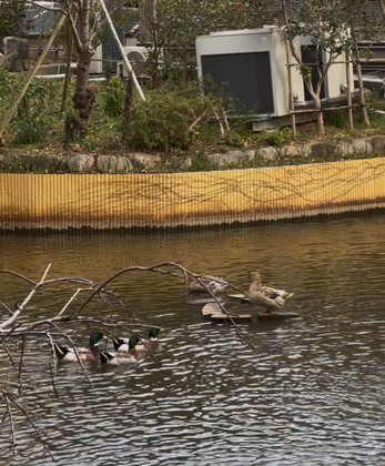 それをそっと掛け直すと、目の前に仲睦まじい鴨の親子が。